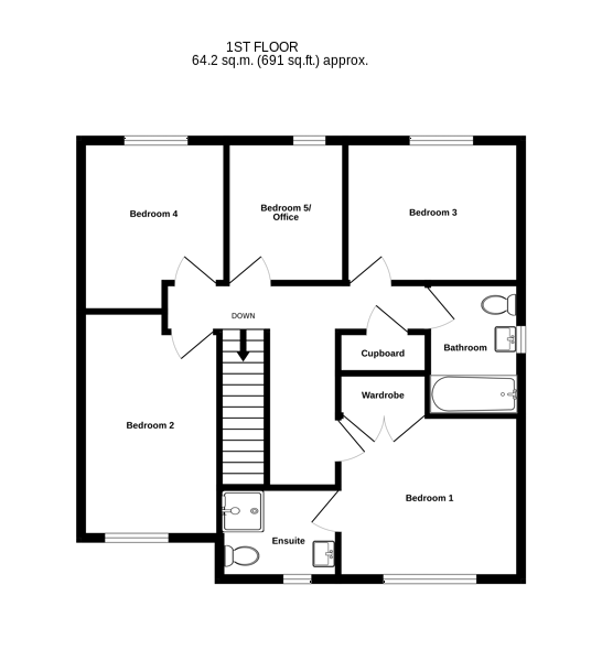 Upstairs, the home continues to impress with five well-sized bedrooms, each offering comfortable accommodation and plenty of storage potential. The main bedroom benefits from a modern en suite shower room, while a contemporary family bathroom serves the remaining bedrooms.