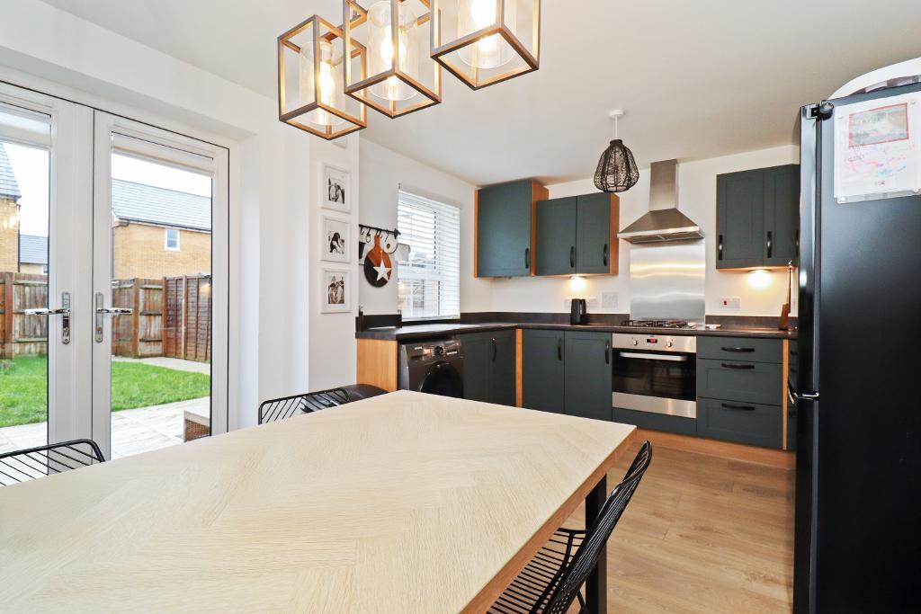 To the rear, the modern kitchen/diner provides an excellent social space, with ample room for dining and entertaining, and patio doors opening directly onto the rear garden, seamlessly blending indoor and outdoor living.