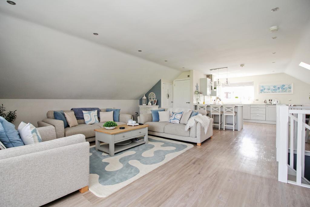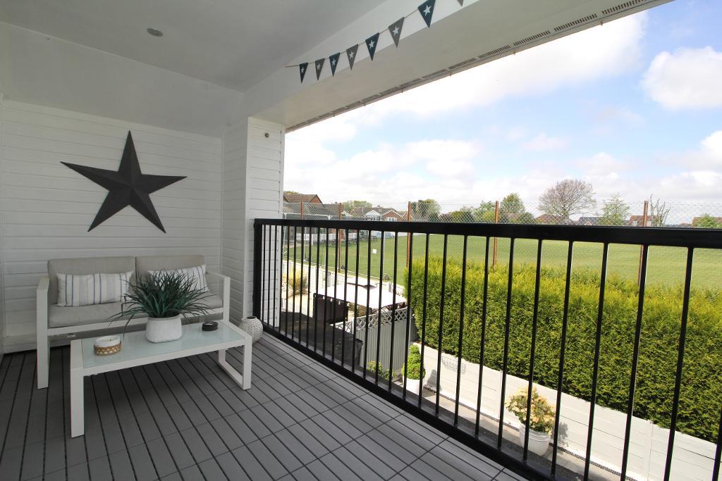 The first floor is dedicated to modern open plan living, creating a bright and sociable space ideal for both relaxing and entertaining. The lounge, kitchen, and dining areas flow seamlessly together, complemented by a convenient WC. From here, double doors open onto a private balcony with delightful views overlooking the cricket ground, the perfect setting for morning coffee or evening unwinding.