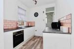 A separate, well-proportioned lounge provides a welcoming living area and leads through to a modern fitted kitchen. The kitchen is equipped with integrated low level appliances, including a fridge/freezer and a combined washing machine/tumble dryer, making excellent use of space while maintaining a sleek finish.