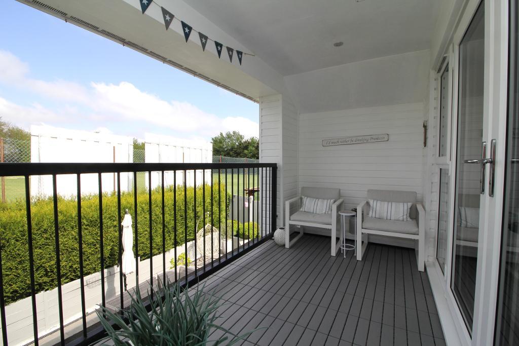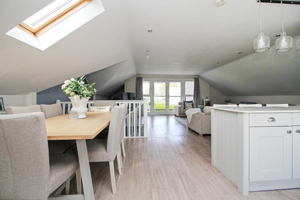 The first floor is dedicated to modern open plan living, creating a bright and sociable space ideal for both relaxing and entertaining. The lounge, kitchen, and dining areas flow seamlessly together, complemented by a convenient WC. From here, double doors open onto a private balcony with delightful views overlooking the cricket ground, the perfect setting for morning coffee or evening unwinding.